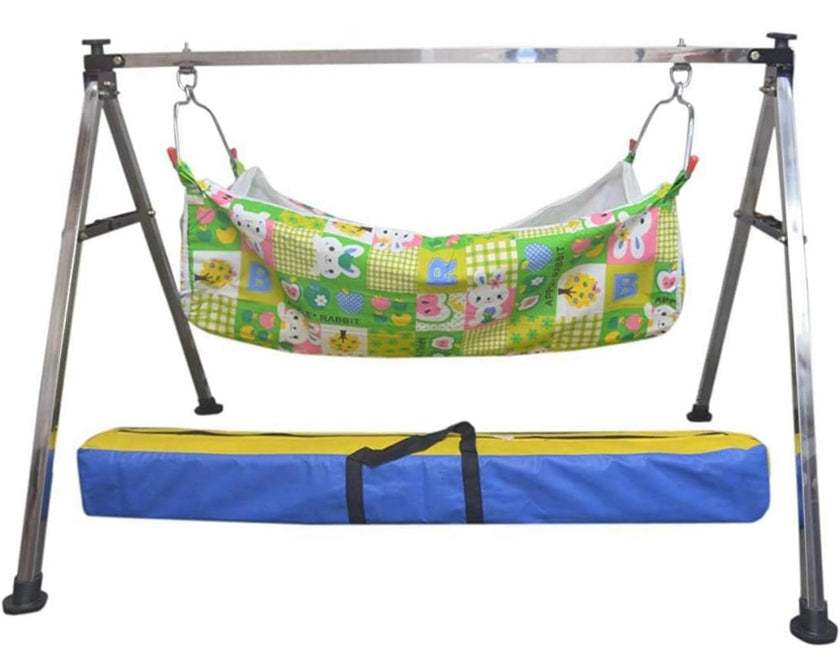 BABY BASKET Portable Folding Steel Swing Baby zoli /Ghodiyu with Hammock Having Mosquito Net, Square, Steel, (1 Khoya, 1 Cradle, 4 Rubber Pads, 2 Pangra,)