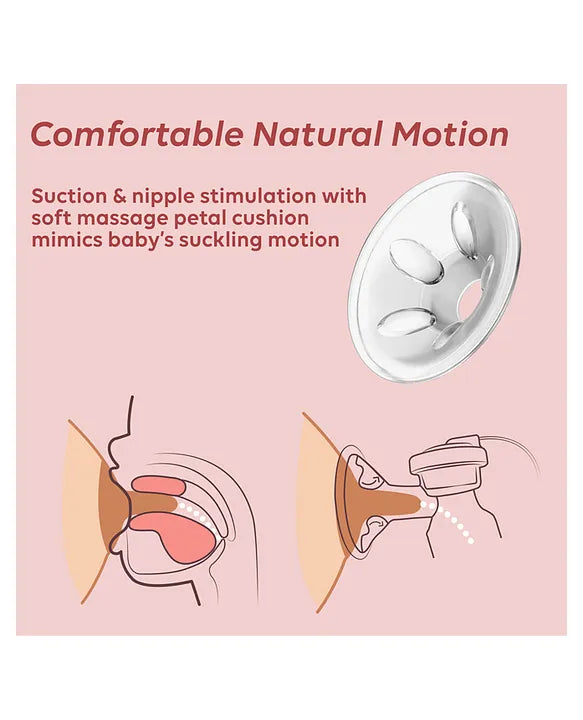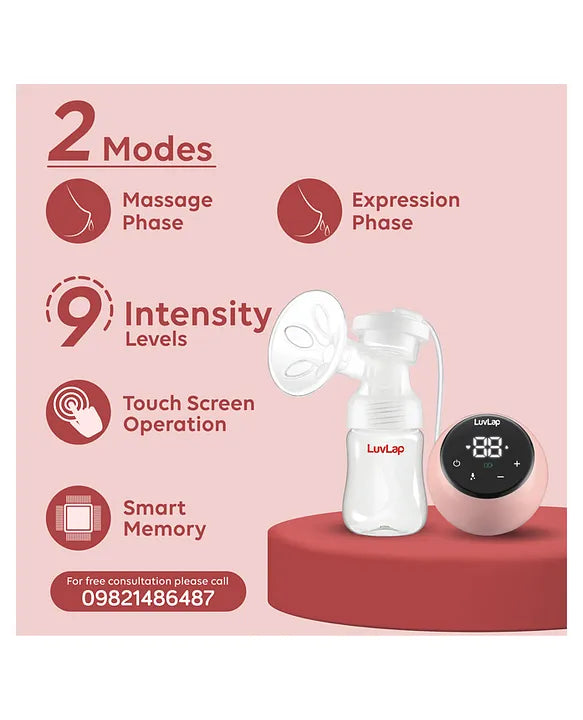 LuvLap Adore Electric Breast Pump is designed to mimic a baby's natural breastfeeding rhythm, making expression a pleasant experience for the mother. The soft silicone massage cushion along with 2 pumping stages of stimulation & expression help to give a natural-like experience. Each mode has 9 intensity levels, and the Smart Memory function remembers the last used setting.